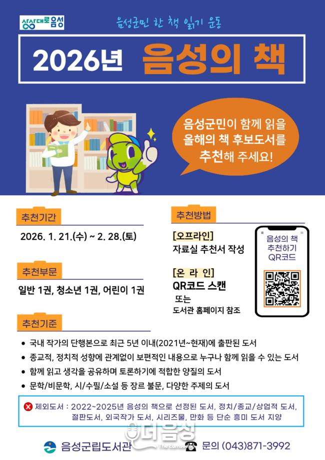 군 관계자는 “군민의 손으로 직접 뽑는 ‘음성의 책’인 만큼, 많은 분의 소중한 추천을 기다린다”며 “2026년 한 해 동안 전 군민이 함께 읽고 이야기 나누며 공감하는 특별한 독서 경험을 누리시길 바란다”고 전했다.