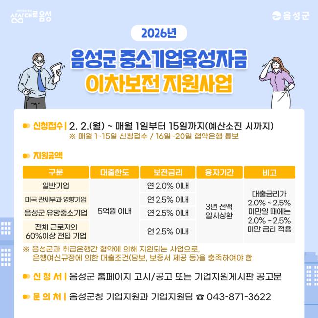강연수 기업지원과장은 “이번 이차보전 지원이 자금난을 겪는 중소기업에 실질적인 도움이 되길 바란다”며 “앞으로도 기업하기 좋은 음성을 만들기 위해 현장 중심의 정책을 발굴해 나가겠다”고 말했다.