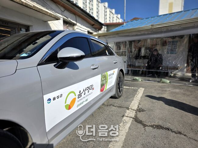 금왕읍 택시정류소에서 손님을 기다리는 택시에 음성군이 제공한 광고가 부착돼 있다.음성군 전역을 누비는 택시 뒷유리에는 붉은색 스티커가 일제히 부착되었다.