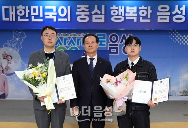 ] 2일 음성군청 대회의실에서 열린 ‘2025년 하반기 적극행정 우수공무원 시상식’에서 조병옥 군수(가운데)가 수상자인 이동희 주무관(왼쪽), 손우영 주무관(오른쪽)과 함께 기념 촬영을 하고 있다.음성군이 창의적인 아이디어와 전문성을 바탕으로 군민 편익 증진에 기여한 ‘2025년 하반기 적극행정 우수공무원’ 2명을 선정하고 2일 정례직원 조회에서 표창장을 수여했다.
