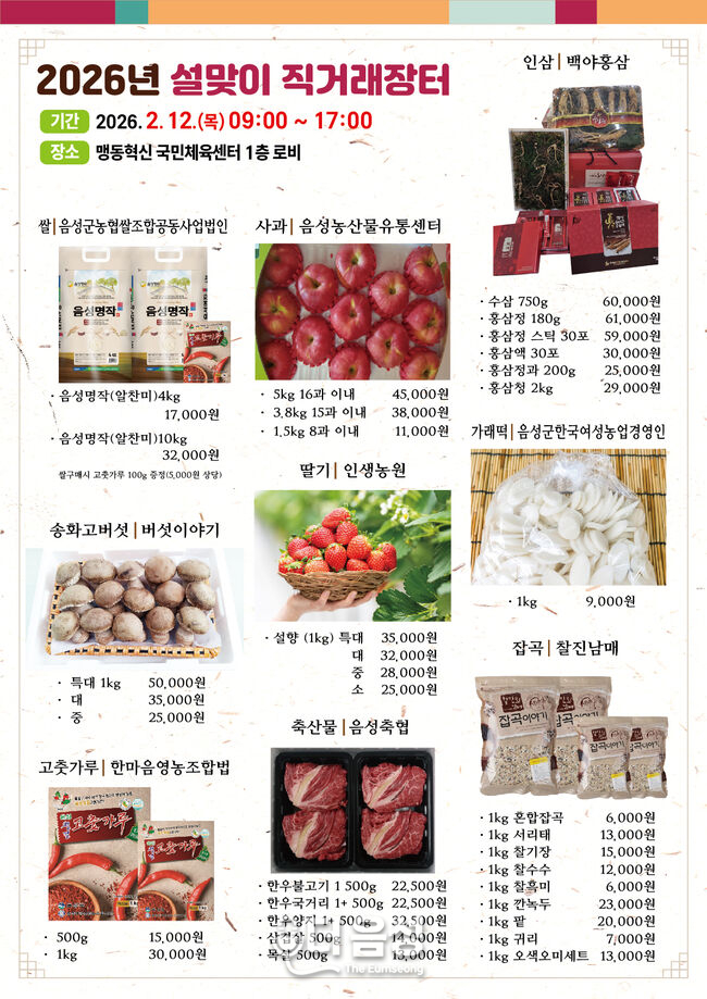 이어 설을 코앞에 둔 2월 12일에는 맹동혁신 국민체육센터에서 본격적인 ‘음성군 농산물 직거래장터’가 열린다. 이번 장터에서는 음성군의 자랑인 쌀, 고춧가루, 사과, 인삼을 비롯해 설 명절 필수품인 가래떡, 버섯, 축산물 등이 판매된다. 관내 농업인이 직접 생산한 고품질 농산물을 시중보다 저렴한 가격에 구매할 수 있어 큰 기대를 모으고 있다.