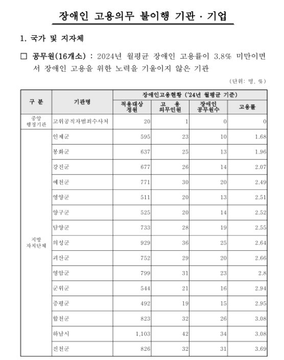 • 진천군: 장애인 고용률 3.69%를 기록했다. 의무 고용 인원 32명 중 31명을 채용해 수치상으로는 의무치에 근접했으나, 최종 불이행 기관 명단에 포함됐다.