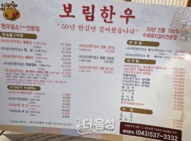 가게 앞에 당도하니 건물의 존재감부터가 남다르다. 2층 규모의 단독 건물 위로 ‘보림한우’라 적힌 간판이 노을진 하늘 아래 위풍당당하게 서 있다. 투박한 듯 독특한 외관은 50년이라는 세월의 켜를 묵직하게 증명하고 있으며, 입구에는 2018년 충청북도가 지정한 ‘밥맛 좋은 집’ 명패가 훈장처럼 빛나고 있었다. 이곳은 고기뿐 아니라 한 끼 식사의 근간인 ‘쌀’마저 허투루 다루지 않는 곳임을 정갈한 명패 하나로 선언하고 있다.