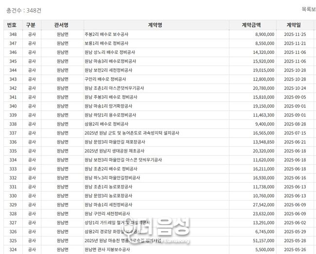 음성군청 계약정보공개시스템 공사수의계약현황(2018.7~2026.2.10 현재) 중 원남면 내역