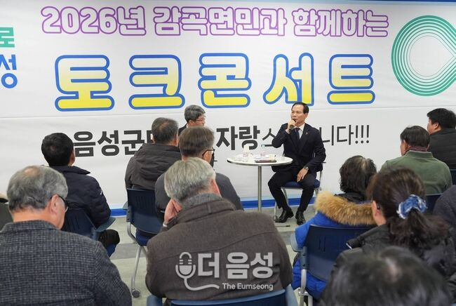 조병옥 음성군수가 지난 달 26일 감곡면 행정복지센터에서 열린 '2026 군민공감 토크콘서트'에서 주민들과 대화를 나누고 있다. 재난 상황 속에서도 군민 안전 최우선, 190여 건 건의사항 접수하며 밀착 소통음성군이 군민과의 직접 소통을 위해 마련한 ‘2026 군민공감 토크콘서트’가 전 군민의 뜨거운 관심 속에 9개 읍·면 순회 일정을 성공적으로 마무리했다.