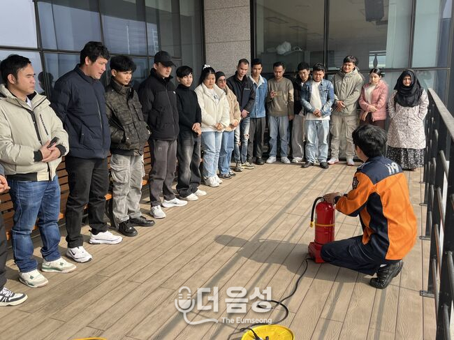 “우리 일터의 안전, 우리가 지켜요.” 외국인 안전 사각지대 해소를 위해 실시된 이번 교육에서 근로자들이 진지한 표정으로 대피 요령 및 119 신고 방법을 경청하고 있다. 충북 경제의 한 축을 담당하며 우리 곁에서 함께 살아가는 외국인 근로자들의 안전을 위해 음성소방서가 팔을 걷어붙였다.