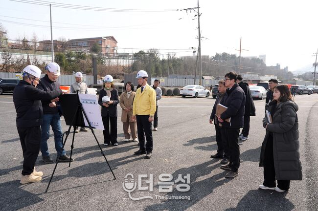 조병옥 군수가 20일 용산산업단지 진입도로 개설공사 현장을 방문해 관계자로부터 사업 추진 현황을 보고받으며 공정 상황을 점검하고 있다. (사진=음성군 제공)