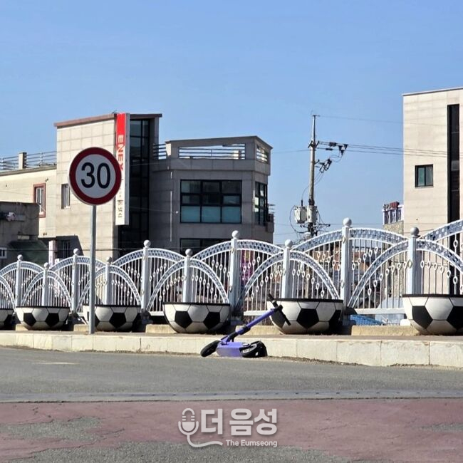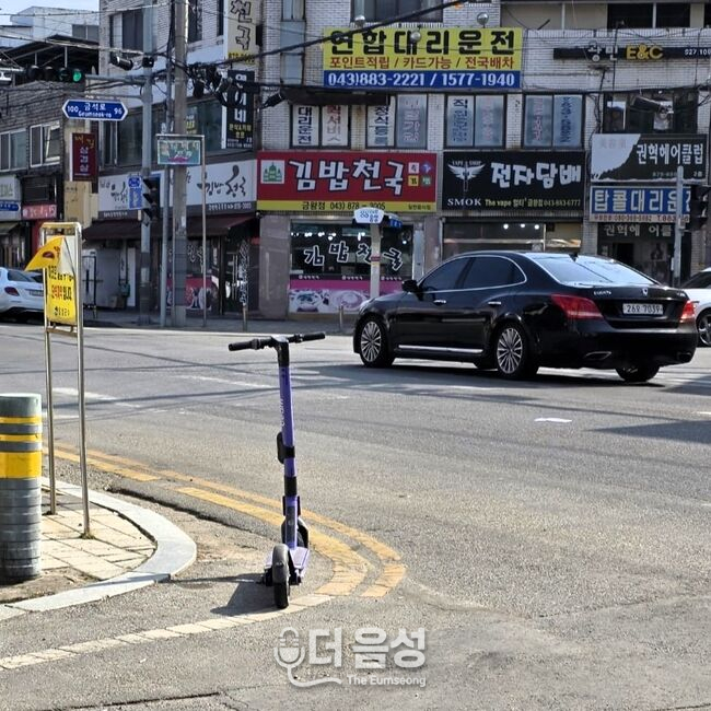 음성군 금왕읍의 한 식당 앞 인도. 누군가 사용하고 버려두듯 쓰러뜨려 놓은 전동 킥보드가 보도를 가로막고 있습니다. 야간이나 비가 오는 날, 이를 미처 발견하지 못한 보행자가 걸려 넘어질 경우 심각한 부상으로 이어질 수 있는 아찔한 상황입니다.