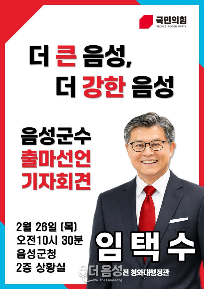 임택수 음성군수 입후보예정자는 오는 26일 오전 10시 30분, 음성군청 2층 상황실에서 기자회견을 열고 차기 군수 선거 출마를 공식화할 예정이다.