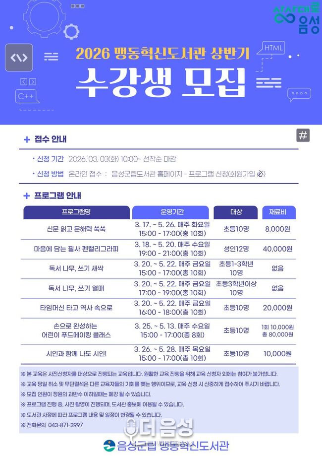 맹동혁신도서관에서 운영하는 ‘2026 상반기 문화교실’ 수강생 모집 안내문. (사진 제공=음성군청) 음성군 맹동혁신도서관이 따스한 봄을 맞아 지역 주민들의 배움과 문화 향유를 위한 ‘2026년 상반기 문화교실’ 수강생을 모집한다.