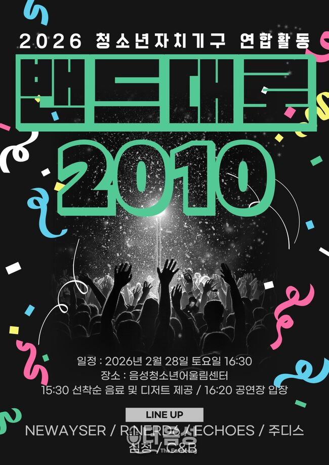 음성군은 이달 28일 음성청소년어울림센터에서 2026년 청소년자치기구 연합활동인 ‘밴드대로 2010’을 개최한다고 밝혔다.