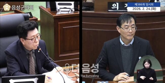 안해성 의원(사진 왼쪽)이 2월 24일 열린 제386회 음성군의회 임시회 제4차 본회의에서 정병헌 가족행복과장을 상대로 공동장사시설 건립 지연 문제를 지적하며 질의하고 있다. 국비 확보를 명분으로 추진 중인 ‘중부 4군(음성·진천·괴산·증평) 공동장사시설’ 건립 사업이 수년째 후보지조차 결정하지 못한 채 표류하자, 음성군의회 안해성 의원이 사업 방식의 전면적인 전환을 요구하고 나섰다.지난 24일 열린 제386회 임시회 제4차 본회의에서 안해성 의원은 정병헌 가족행복과장을 상대로 공동장사시설의 지지부진한 진행 상황을 강하게 질타하며, 음성군 단독 추진을 포함한 전향적인 대책 마련을 촉구했다.