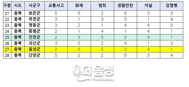 • 음성시 건설 꿈꾸는 음성군, 안전지수는 ‘빨간불’...범죄·자살 분야 최하위권