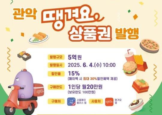 `공공배달앱 활성화 시범 자치구` 관악구(구청장 박준희)가 오는 6월 4일 10시부터 5억 원 규모의 관악 땡겨요(공공배달앱) 상품권을 추가 발행한다.