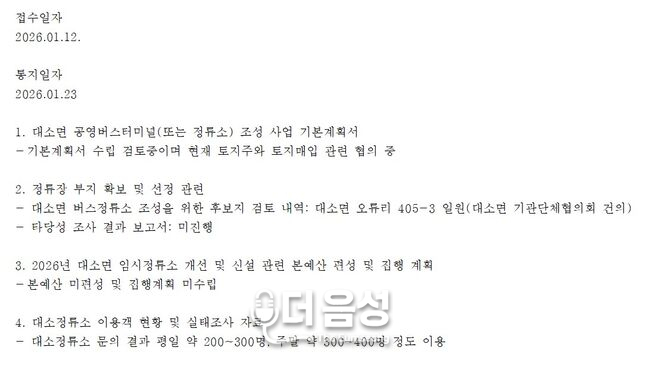 답변 내용은 "검토 중", "미편성" 등 단 몇 줄뿐이었다. 읍 승격을 축하하는 보도자료는 쏟아내면서 주민의 간절한 물음에는 12일간 침묵한 음성군은 주민의 알 권리를 철저히 기만하고 조롱했다.