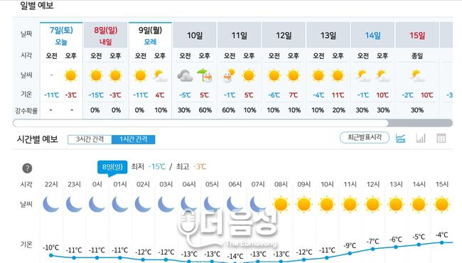 [한 주간 날씨보도] 음성군, 일요일 아침 '영하 15도' 한파 절정... 주 중반 눈·비 소식