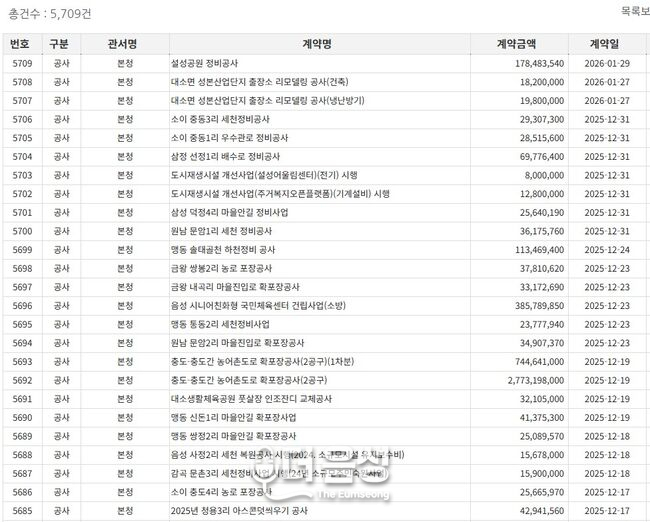 특히 최근 지역 사회와 본지(더음성)가 제기한 비판에 따르면, 본청 발주 사업들이 특정 업체들에 집중적으로 배정되고 있다는 의혹이 짙다. 1인 견적 수의계약의 허점을 이용해 고액 사업을 소액으로 나누는 '쪼개기 계약' 수법이 동원되고 있다는 것이다. 이는 내부 통제 기관인 본청이 오히려 부정의 근원지가 되고 있다는 비판을 면하기 어려운 대목이다.