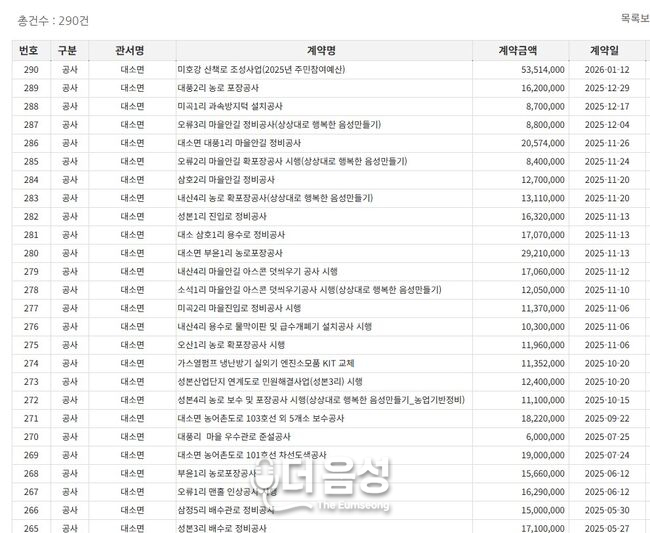 음성군청 계약정보공개시스템 공사수의계약현황(2018.7~2026.2.10 현재) 중 대소면 내역최신 인구 데이터와 대조한 지역별 수의계약 현황은 더욱 충격적이다.