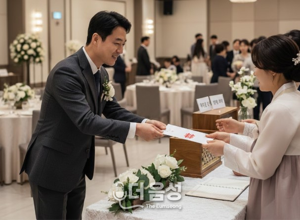 축의금을 전달하고 있는 하객. (기사 이해를 돕기위한 AI생성 이미지)축하의 마음이 오가야 할 예식장이 어느덧 ‘계산기’를 두드리는 부담의 장이 되고 있다. 최근 고물가 흐름 속에 예식장 식대와 대관료가 급격히 오르면서, 음성 지역 하객들 사이에서도 ‘축의금 인플레이션’에 대한 우려가 커지고 있다.