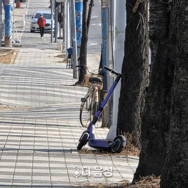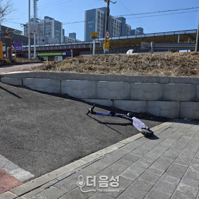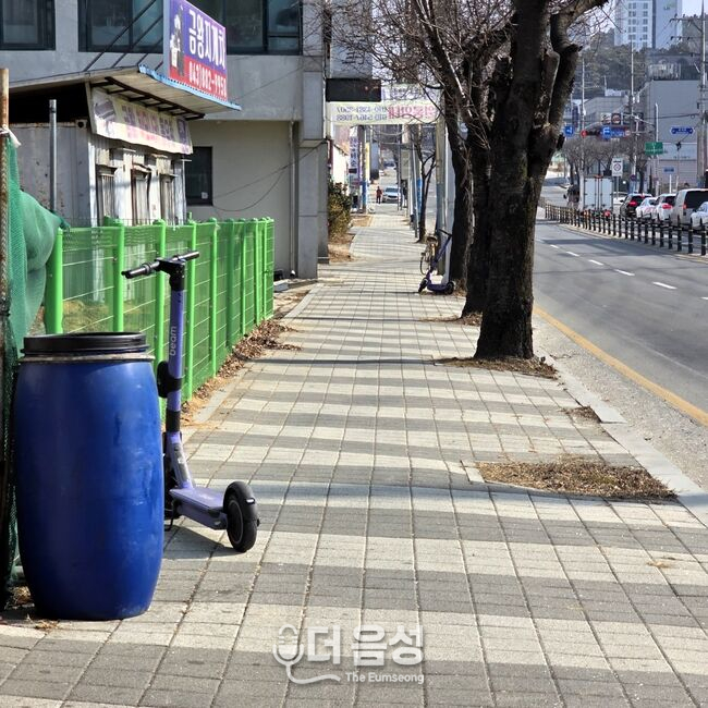 음성군 금왕읍의 한 식당 앞 인도. 누군가 사용하고 버려두듯 쓰러뜨려 놓은 전동 킥보드가 보도를 가로막고 있습니다. 야간이나 비가 오는 날, 이를 미처 발견하지 못한 보행자가 걸려 넘어질 경우 심각한 부상으로 이어질 수 있는 아찔한 상황입니다.