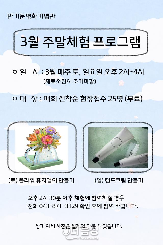 반기문 평화기념관이 3월 한 달간 관람객을 대상으로 운영하는 주말 무료 체험 프로그램 홍보 포스터. 음성군 ‘제8대 유엔사무총장 반기문 평화기념관’(이하 평화기념관)이 완연한 봄기운이 시작되는 3월을 맞아 관람객들을 위한 다채로운 주말 무료 체험 프로그램을 운영한다.