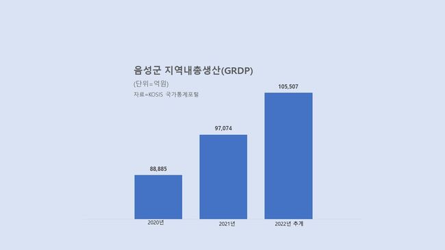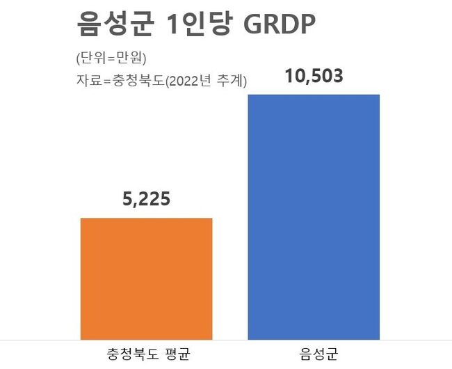 음성군 지역내총생산군민 개개인의 생산성을 나타내는 1인당 GRDP 수치는 더욱 눈부시다. 음성군의 1인당 GRDP는 1억 503만 원으로, 충북도 평균(5,225만 원)의 두 배를 웃돌며 2년 연속 도내 1위를 차지했다.