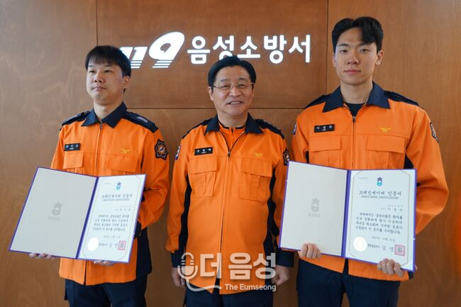 음성소방서 ‘브레인 세이버(Brain Saver)’ 수여식 현장. (왼쪽부터) 최민호 소방교, 장현백 음성소방서장, 이정민 소방사가 인증서 수여 후 기념촬영을 하고 있다. 이들은 신속한 응급처치로 뇌졸중 환자의 생명을 구한 공로를 인정받아 이번 인증서를 수여받았다. 음성소방서(서장 장현백)는 지난 15일, 긴박한 현장에서 정확한 판단과 응급처치로 시민의 소중한 생명을 구한 구급대원들에게 ‘브레인 세이버(Brain Saver)’ 인증서를 수여했다고 밝혔다.