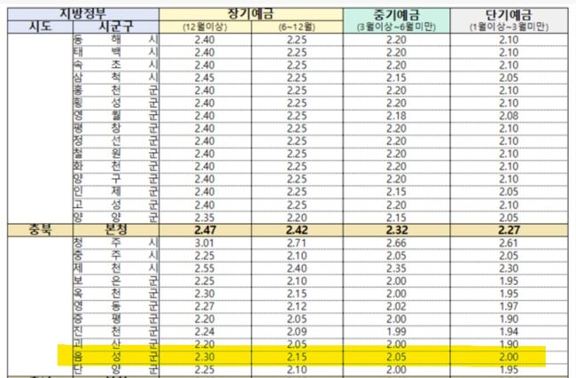 지난 28일 행정안전부가 ‘지방재정 365’를 통해 공개한 현황에 따르면, 음성군 금고(제1금고 NH농협은행)의 12개월 정기예금 금리는 2.30%를 기록했다.