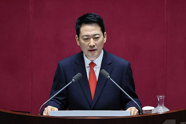 장동혁 국민의힘 대표가 4일 국회에서 열린 본회의에서 교섭단체 대표연설을 하고 있다.