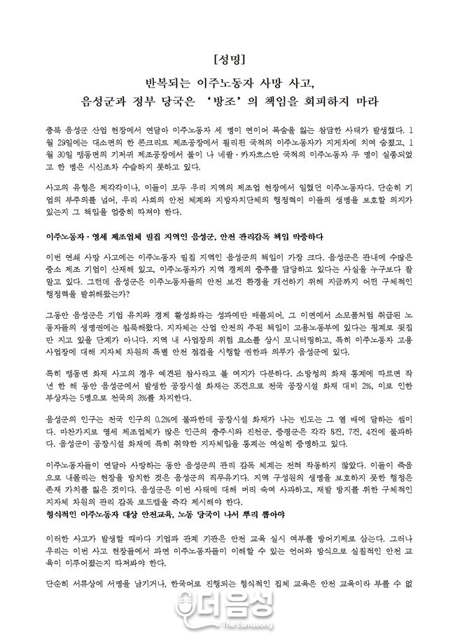 음성노동인권센터 성명서최근 충북 음성군 산업현장에서 이주노동자 3명이 연이어 목숨을 잃는 참사가 발생하자, 지역 시민단체가 음성군과 정부 당국의 책임 있는 대책 마련을 강력히 촉구하고 나섰다.