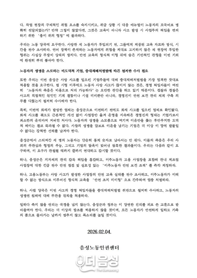 센터는 이번 사태 해결을 위해 ▲음성군의 관내 제조업 사업장 긴급 전수 점검 및 '이주노동자 안전 보건 조례' 제정 ▲고용노동부의 안전 교육 실태 조사 및 처벌 강화 ▲사법 당국의 중대재해처벌법 무관용 원칙 적용 등을 강력히 요구했다.