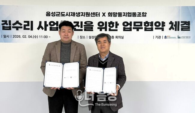 음성군도시재생지원센터와 희망둥지협동조합이 업무협약을 체결하고 기념 촬영을 하고 있다. (왼쪽부터 문상철 희망둥지협동조합 대표, 김영환 음성군도시재생지원센터장) 음성군도시재생지원센터와 희망둥지협동조합이 지역 내 취약한 주거환경을 개선하고 주민들의 삶의 질을 높이기 위해 상호 협력 체계를 구축했다.